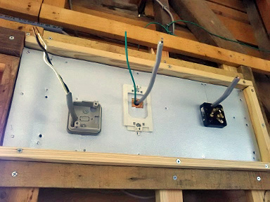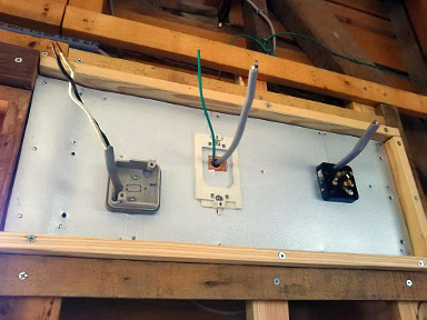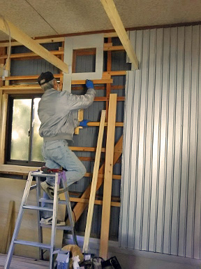 最大の難関&メンドクサイ仕事は コンセントを鋼板を突き抜けて 上に出さなくてはいけないこと 鋼板を壁紙みたいにペタペタ張っていくだけなら 簡単なのですが・・・ |