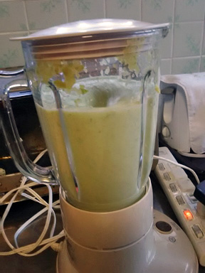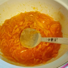 ミキサーに入れて撹拌します 水は入れないので、最初の回転のわるいこと! 一回目にできたジュースのおかげで |