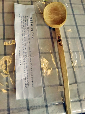 飛騨のお土産に頂いた「有道しゃくし」は 先が粥状のものをかき混ぜやすいように 平たく薄くけずってあって、ジャムを混ぜるのに最適です かの白洲正子氏も絶賛されたとか、左の紙に書いてあります |