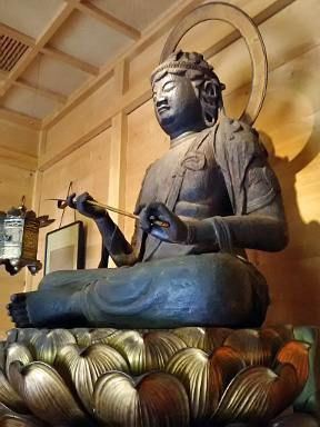 一方、右横顔は唇に笑みを浮かべて 眉はなだらかに、肩も撫で肩 女性を表すそうです こちらの普賢菩薩の特徴的なことは 螺髻(らけい)と呼ばれるぐるぐる巻いて 束ねた髪の毛が長いこと長いこと 耳に幾重にも巻いて肩に垂れています 楠の一材から彫り出された堂々とした量感溢れるお姿と 強い意思を感じさせる肉付きのよいひきしまったお顔を いつまでも見上げていたいと思いました |