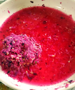 レモンで花びらを揉み混むと 綺麗なローズ色の汁が出てきます |