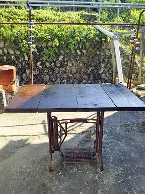古いミシンの機械部分を外して テーブルの脚にしました 脚と天板は取り外しが利くようになっています |