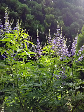 <西洋人参木> 花が終わると短く切ってしまう西洋人参木ですが 春の終わり頃からめきめきと枝を伸ばして こんなに旺盛に紫の穂状の花を見せてくれています |