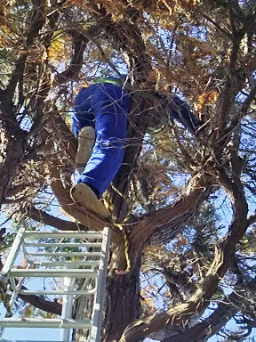 梯子の高さの枝を払い終わったら、なんと! 子供のころ登ったことがあるからと言いながら、 そのままどんどん登って行きます (下から叫ぶ制止の声なんか聴こえていません!) |
