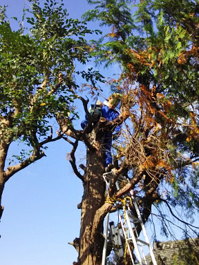 先ずは梯子の高さで下から順番に枝を払っていきます (左下から出ているように見える枝は落下する枝です) |