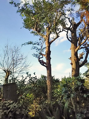 きょう1日の成果 左のヒバは下から切って長目の切り株に 右のヒバは一部日蔭用の枝を残しましたが、ほぼ丸坊主 |