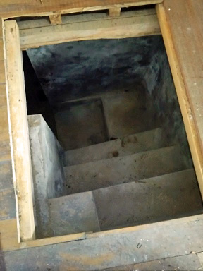 台所の床の下の扉を開けると 地下室に続く階段が現れました |
