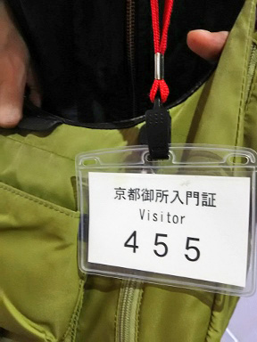研修旅行と勝手に銘打って 一泊二日の京都に行きました 晩秋の気配うがまだ残る 小春日和の良いお天気に恵まれたのが何よりでした 現在は御所の拝観は通年自由になりましたが 入口で手荷物検査をされて こんな通行証を首にぶら下げて中に入ります |