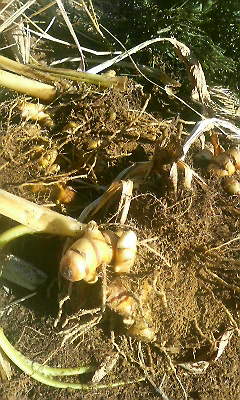 葉がすっかり枯れて、倒れかけているのもあったりして もう堀りどき、と堀り上げてみました 今年も根茎はしっかり張って うっかりちょん切ってしまった切り口から 鮮やかな黄色がこぼれて見えます 染め物にしたら こんなに綺麗なウコン色になるのでしょうか? |