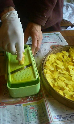 さて、これからがたいへん! 水で綺麗に泥を落としたら 生姜に付いてるようなハカマを丁寧にこそげ落として (この間立ちっぱなしの水仕事!)・・ それからスライサーでスライス |