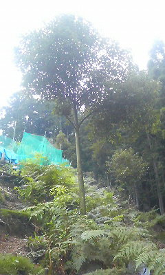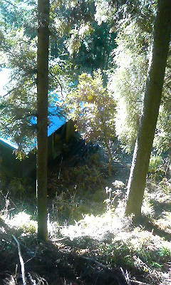 隠されていたメッセージパートA ジャルダンに通じる林道からなにげなく下を眺めていて 発見! 木にぶら下がるナニやら丸くてボコボコした 黄色い物体・・!蜂の巣!? (←写真中央です) |