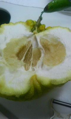 割ると夏蜜柑かザボンのような果肉が 灰汁が強いので重曹を入れて 何度もゆでこぽしながらジャムにしました 味は夏蜜柑のマーマレードと殆んど同じ |