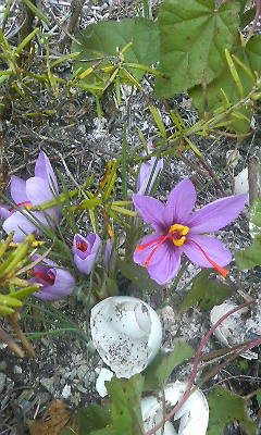 難を逃れたサフラン 一つの花についてる三本の雌しべ これを溜めておいて乾かして、パエリア?サフラン石鹸? 素晴らしい香りは、離れた場所に居ても漂ってきます |