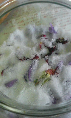 <モイストポプリ> 簡単に言えば・・香りの良い生のハーブの塩漬け 生干しにしたオールドローズとサフランを塩に埋めて 上からブラウンシュガーひとつまみと ブランデーを少しふりかけます 冷暗所に置いて2ヶ月熟成すれば 出来上がり!・・のハズ・・ 楽しみです |