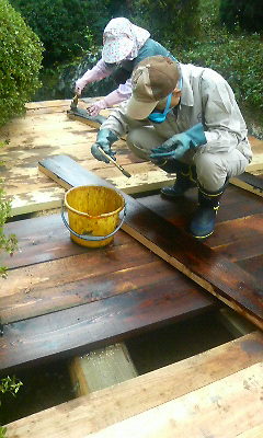防腐剤塗り マスクにメガネと手袋の重装備で |
