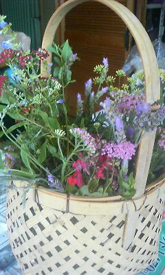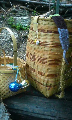 今日の収穫物 手前の篭の中には、今ごろでもみずみずしい グリーンの葉っぱのゼラニュームとクリスマス・リース用に ローリエの葉っぱが少し 大きな篭の中の棒っ切れのようなのは 伏せ込み用のタラの木 |