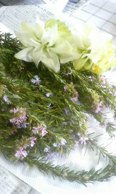 今あちこちに植わってるローズマリーが 可憐な花を咲かせています ハンガリー水には、薬効に優れているこの花盛りの頃の ローズマリーを浸けると良いとか ウコンは近所の達人のおばあちゃんに 花は早く採ってしまわないと株のためにならないよ、と 教えて頂いたので切り取ってお風呂に入れました 南国のリゾートのお風呂みたいでした ゴクラク、ゴクラク |