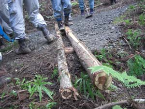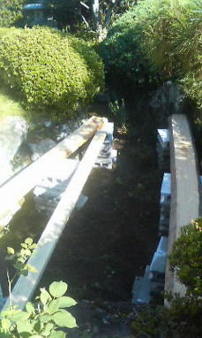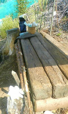 世話をする人がいなくなってから池の水は抜いてあったので 池はただ、落っこちないように用心して歩かなければいけない 無用の長物となっていました そうだ!池に盖をしてしまえ! それで、製材所のランバさんに相談 この道五十年のランバさんはさすが! 四メートルに決められた原木から、ロスの出ないように 切り方を考えてくれて、覚悟していたよりウンと安く 材木を調えてくれました(感謝) ホームセンターではこんなわけには・・ 血の通ったコミュニケーションが成立するところが 産直の良いところですね 土台のブロックを六ヶ所に積んで 厚めの板を二本渡しました |