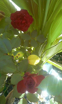 一季咲きが多いオールドローズにしては 思い出したようにして何度も咲き出す 深紅のフランシス・デュプルイ うっかり傍に植えてしまったウコンの陰に 咲くことになってしまいました |