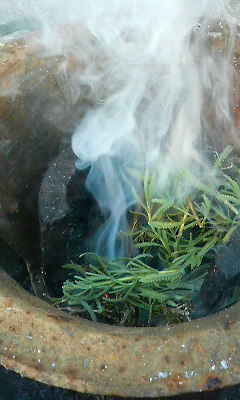 火鉢やらストーブやらの部品を 廃物利用した囲いの中に炭を熾こして ローズマリーとラベンダーをくべてみました どんなにいい香りがするかと期待しましたが・・ |
