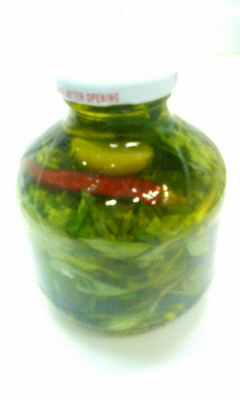 これはニンニク、唐辛子、粒胡椒も入れて、 オイルに浸けたものです |