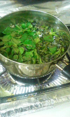ミントを濾した煮汁に白砂糖を6カップ加えて 少しトロミが出るまでに煮詰めると こんな風に出来上がり! |