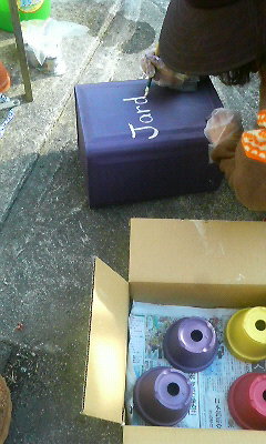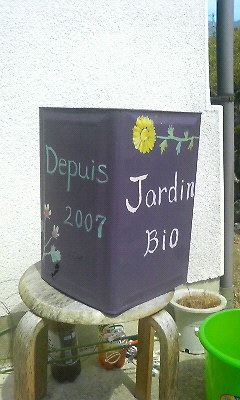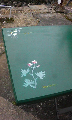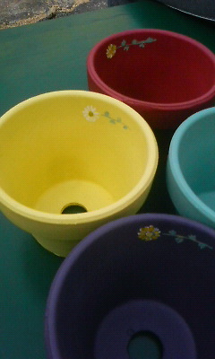 ついでにこんなものにも・・ 納屋に転がっていた錆びた一斗缶に色を塗って、 |