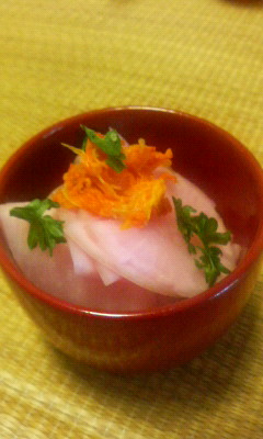 ハーブをオセチに使ってみました お雑煮の上に菊の花びら |