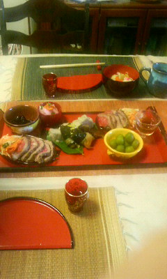 長いお盆にオセチを並べてみました 真ん中の昆布巻きと煮物の下に敷いている緑は ジャスミンの葉っぱ 見渡すところ、唯一使えそうな葉っぱでしたので ジャスミンは寒がりなので 冬季は部屋の中に入れています |