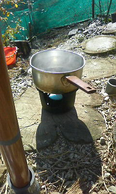 なかなか沸騰しないので、急遽紙皿で蓋をしたり
