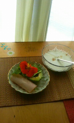 ナスタチウムの花と葉っぱ、アボガト、ハムのサラダに