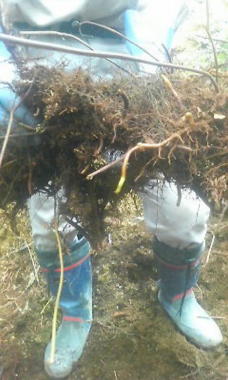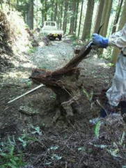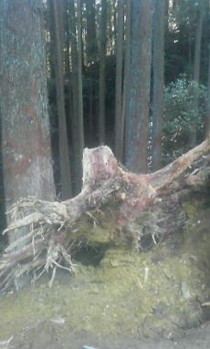 9月の台風がもたらした大崩落以来 まるで大きなタコのような根っ子に 張り付かれて苦労していた杉の木を 毎日々少しづつ掘り進んで やっと救出 |