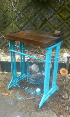 一役も二役も終えたミシンの台 鉄の脚の錆を落としてから、ターコイズブルーのペンキを 塗ったら・・おっ!我ながらなかなかいい味が・・ 作業台に?ただのモニュメント? |