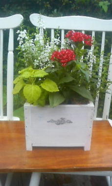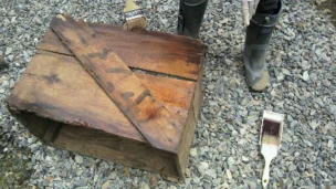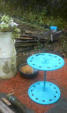 ブリキの衣装カンの蓋に 黄色いペンキを塗って 即席のベンチに 仕立てましたが・・ 体重制限あり |