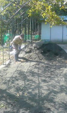 道作りにも 私の大胆道作りのご紹介です まず、砂を敷き詰めて 傾斜をだいたい水平にとります(ゼンゼンいい加減です) その上に、ジャルダン特産(?)黄色い粘土をのせて 混ぜ合わせます |