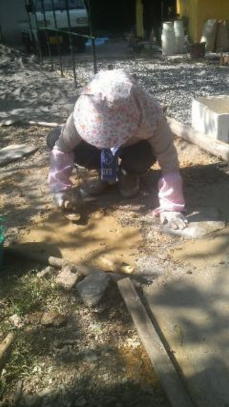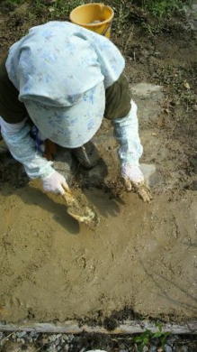 あとは、いい加減な分量の(お得意の)セメントと 黄色い粘土をゆるく水で溶いたものを上から流し込んで 塗りますが、この時粘土の黄色が表面に出るように 何度もこすりつけます |