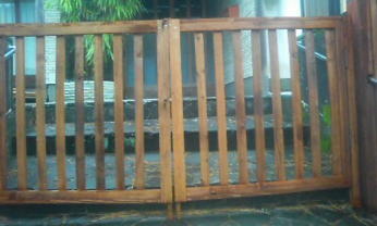 ←凹の切りこみ 門扉を階段の途中に付けようとしたため、門柱を立てるのに、う〜む・・ 取り付ける方法を夜通し考えてたみたい 閃いたのが、階段の左右に取り付けられた転倒防止用の手すり 門柱に凹の切り込みを入れて手すりを挟み込む形で固定する、というアイデア! |