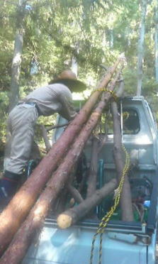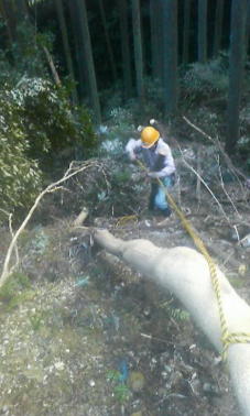 谷に倒れこんだ雑木を チェーンソーで適当な長さに切って ロープで引き上げてみれば |
