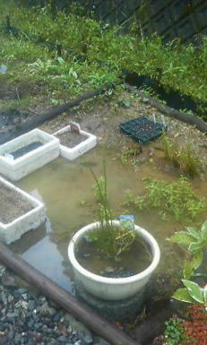 この「ビオトープ」、 種蒔きのあと、腰水で育てるのに丁度良くて 秋まきの種の苗置場になってしまいました |