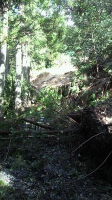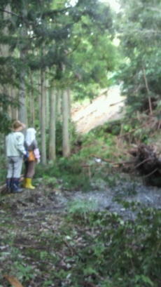 本来なら山肌に立っていたはずの雑木 土砂と共に流れて無事に道路脇に着地 |