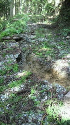 前から気になっていました箇所が 幅20メートル近く崩落して、下の林道をまたいで 土砂が谷に流れてしまいました そのために、山の上に通じる唯一の道は 土砂や滑ってきた樹木で埋まり通行不能! |