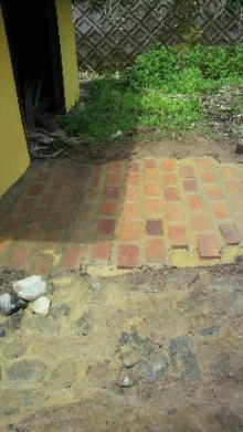 どしゃ降りのあとになると 足をとられてしまうほどのぬかるみとなる場所に 砂をシコタマ入れました 家で余っていた敷石を所々に嵌め込んで 間にミントを植えてみました |