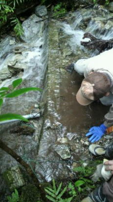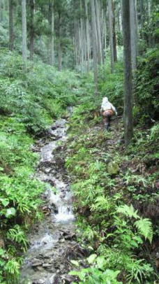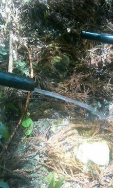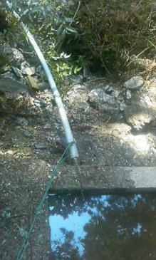 水工事 昔々、何十年も前に、 隣の谷の上流にコンクリートで水源工事を施して、 水を引き入れていた家があって、 よくよく探してみるとその時のホースが残っていました |
