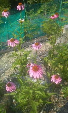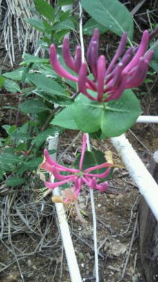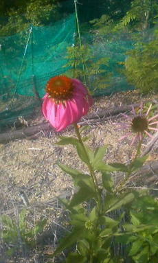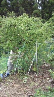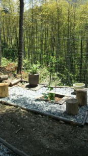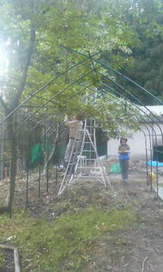 門扉ができるまで、納屋から出てきた パイプの枠組みに網をはって、 網の囲いに続く取りあえずの入口を 作りました 通りかかった人から鹿でも飼うの?と 冷やかされますが、こうしておかないと 色んな動物に入られて 植栽したものを荒らされてしまいます |