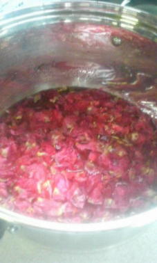 皮を三回ほど茹でこぼしたあと身を合わせて、 夏みかんの目方の半量の砂糖をいれ、 アクをとりながら煮詰めます トロミが出てきたら、別に煮ておいた、種から取ったペクチンを 加えて更に煮詰めます |