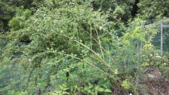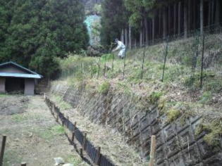 以前は下からは木で隠れてほとんど見えなかった 鹿よけフェンスが丸見えに フェンスギリギリに植えられていた梅の木は 斜面中腹で無事着地 (←梅の木) |