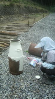 風雨に晒しているのでだんだん傷んできた味噌樽に ニスを塗りました 本当は柿渋で塗りたいところですが・・ |