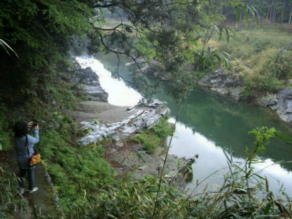 神社から川に降りる道をたどると、 エメラルドグリーンに沈む淵が現れます 昔々、伊勢の神と水屋の神が国境を 決めようと、大きな石を川に投げ入れて、 波が止まった高見の地を国境と定めた、 という神話の、神様たちが 石を投げ入れたのがココだそうです (←写真を撮りまくるジャルダン人A) |
