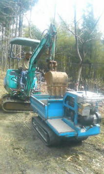 高低差の大きい土地を地ならしするために、ユンボで 掘った土をキャタピラー付きの運搬車に乗せて運びます |