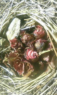 なんだかきたな〜い皮を被っていて、 腐っているのでは?と、思わずめくってみたら、 中には初々しいピンクの葉っぱができてました これがだんだん赤みを帯びてくるようです |